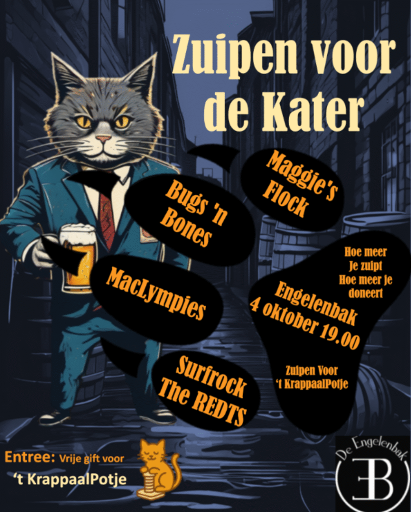 Net als vorig jaar wordt ook dit jaar op Dierendag, 4 oktober, een benefietconcert georganiseerd in Café de Engelenbak in Doetinchem. Vanaf 19.00 uur is iedereen welkom om te genieten, maar vooral om goed te drinken: voor elke consumptie gaat een deel van de opbrengst naar ’t KrappaalPotje, wat zich inzet voor hulp bij dierenartskosten. Alle bands die optreden, doen dat volledig op vrijwillige basis. De entree is een vrije gift, zodat het feest voor iedereen toegankelijk is en de gehele opbrengst ten goede komt aan ’t KrappaalPotje. Kom dus dansen, drinken en genieten van de tweede editie van ‘Zuipen voor de Kater’ in Café de Engelenbak!